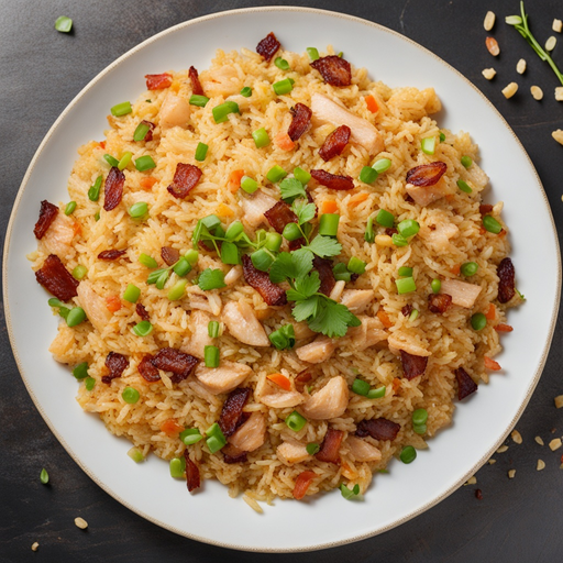 Un délicieux plat de riz frit savoureux avec du poulet tendre, du bacon croustillant et de l'ail savoureux.