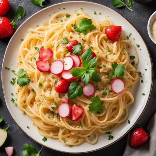 5. Servir les spaghettis carbonara chauds avec une salade fraîche aux fraises composée de fraises tranchées, de radis en dés et de pommes de terre de l'Idaho bouillies mélangées avec du riz brun.
