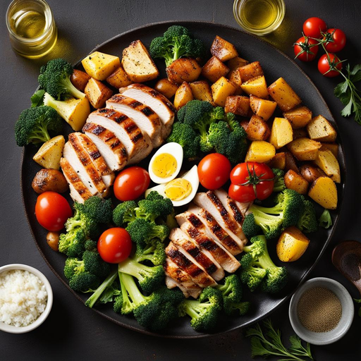 1. 1. Préchauffez le grill à feu moyen-élevé. 2. Assaisonnez les blancs de poulet avec du sel de roche, du poivre et un filet d'huile d'olive extra-vierge. 3. Faites griller le poulet pendant environ 6 à 8 minutes de chaque côté, ou jusqu'à cuisson complète. 4. Pendant ce temps, faites bouillir les pommes de terre et les œufs jusqu'à ce qu'ils soient cuits. 5. Faites cuire le brocoli à la vapeur jusqu'à ce qu'il soit tendre. 6. Coupez les tomates fraîches, le poivron vert et le maïs en morceaux de taille bouchée. 7. Une fois que tout est cuit, assemblez le poulet grillé, les œufs bouillis, les pommes de terre, le brocoli cuit à la vapeur, les tomates fraîches, le poivron vert et le maïs sur un plateau.