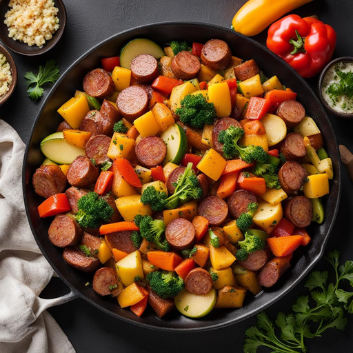 Un repas copieux et savoureux cuit dans une seule poêle, mettant en vedette de la saucisse fumée et une variété de légumes colorés.