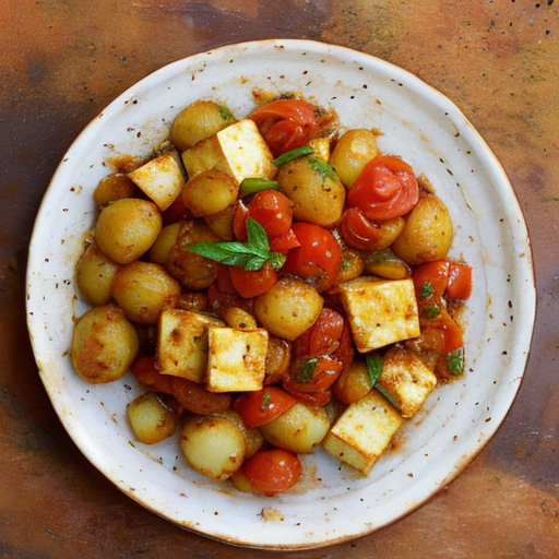 Un délicieux plat à base de tomates fraîches, de pommes de terre nouvelles et de tofu ferme.