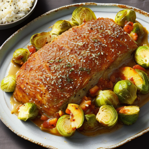 Un délicieux plat principal à base de jambon au four, de choux de Bruxelles et de confiture douce de pêche.