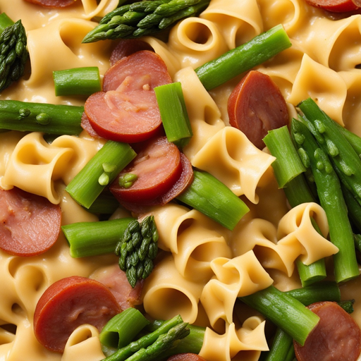 Um delicioso prato de massa cremosa com kielbasa saboroso e aspargos frescos, perfeito para uma refeição reconfortante.