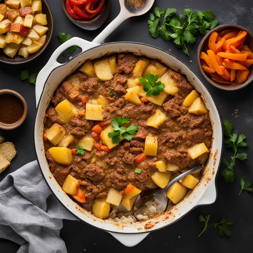 Um prato de casserole consistente com carne macia, batatas e um molho cremoso, coberto com uma crosta saborosa.