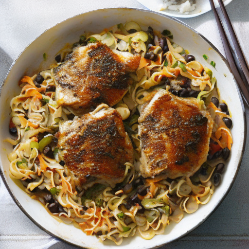 Um prato substancioso com coxas de frango suculentas, macarrão saboroso e feijão preto temperado.