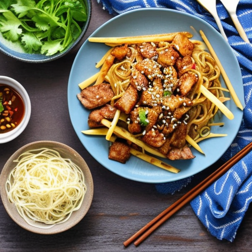 Um delicioso e picante stir-fry com carne de porco, noodles e sabores tailandeses