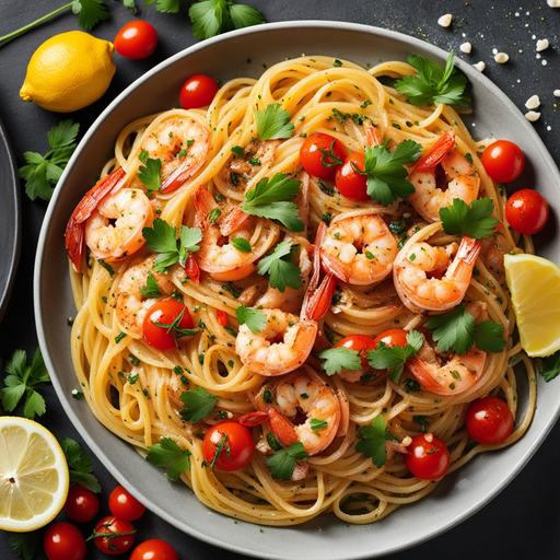 Um prato de massa saboroso e picante com camarão suculento e macarrão linguine