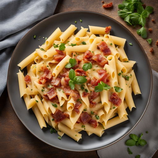 Delicie-se com um prato de massa rico e cremoso com pedaços crocantes de pancetta.