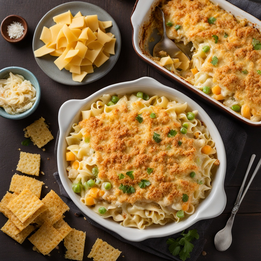 Um creme reconfortante de frango com macarrão ao forno e uma cobertura crocante de flocos de milho