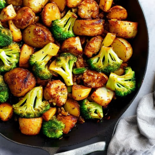 Um prato delicioso e saudável com salsicha de frango, batatas Yukon douradas, floretes de couve-flor e floretes de brócolis.