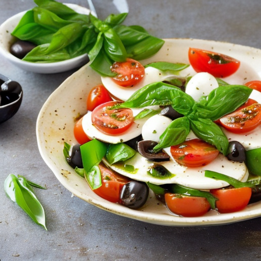 Uma salada refrescante com mozarela fresca, tomate cereja e manjericão fresco.