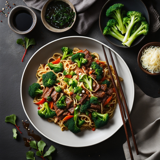 Um prato de stir-fry delicioso e salgado com carne macia, brócolis crocantes e macarrão de ovo mastigável.