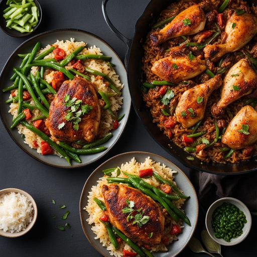 Uma refeição deliciosa e apimentada em uma frigideira com frango macio, arroz saboroso e feijão verde crocante.