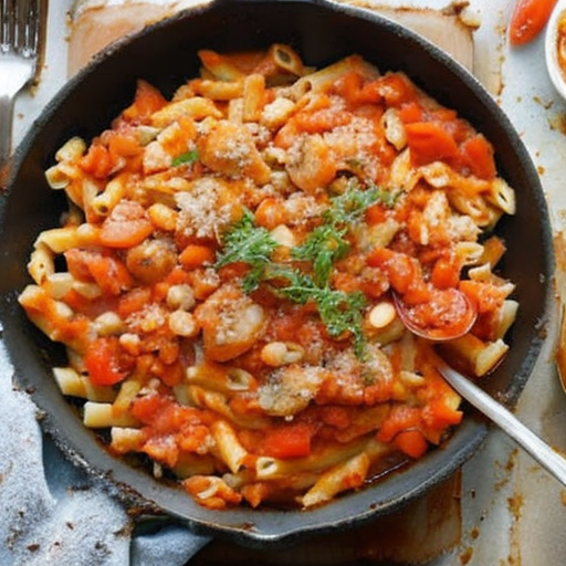 Um delicioso prato de macarrão com tomates frescos, legumes e feijão cozido.