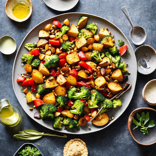 Um prato assado saboroso e aromático com uma mistura de batatas, brócolis e couve-flor infundida com sabores defumados e ervas aromáticas.