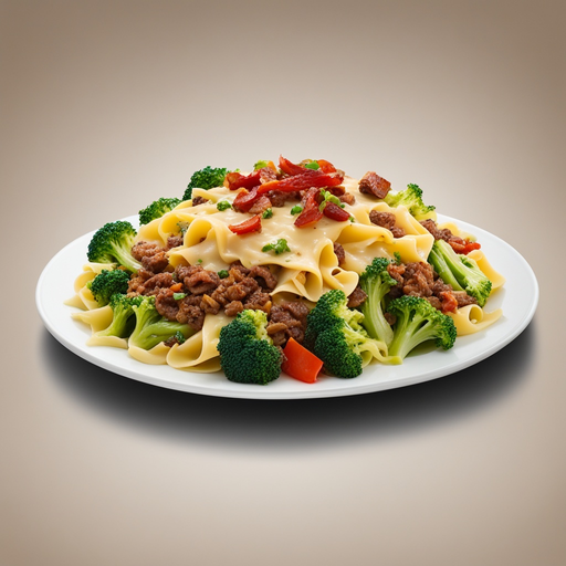 6. 6. Monte o prato colocando em camadas o macarrão cozido, a mistura cremosa de carne, o brócolis cozido no vapor, os pedaços crocantes de bacon, alface romana, pimentão fatiado e queijo americano ralado em um prato de servir.
