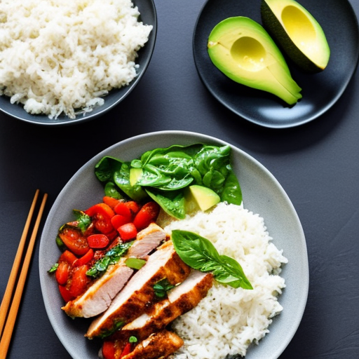 Uma tigela saborosa e nutritiva com frango temperado com adobo, legumes frescos e queijo mussarela cremoso sobre uma cama de arroz fofo.