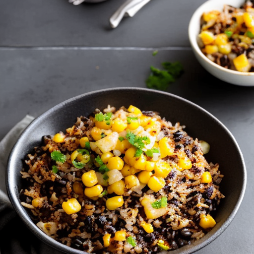 Um prato saboroso e reconfortante feito com feijão preto, milho doce, arroz basmati, pimenta ancho e pedaços de abacaxi.