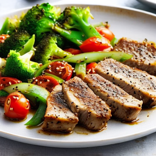 Uma deliciosa receita de bifes de atum grelhados com brócolis e tomates. Os bifes são marinados em cebolinha, coentro picado, óleo de gergelim escuro e molho de soja com baixo teor de sódio, depois servidos com brócolis cozido no vapor e tomates cereja suculentos.