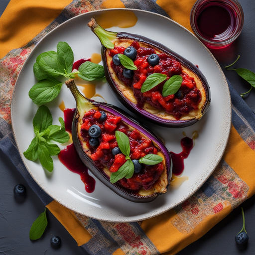 Um prato único e saboroso com beringela recheada coberta com um molho doce e agridoce de frutas vermelhas.