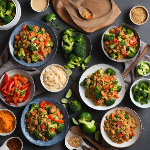 Um stir-fry delicioso e nutritivo com quinoa, ovos, linguiça de frango e legumes em um molho de manteiga de amendoim.
