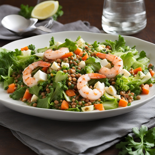 2. 2. Em uma tigela grande, misture camarão cozido, ovos cozidos picados, salsinha fresca picada, alface cortada em fatias, floretes de brócolis cozidos no vapor, cenouras raladas e lentilhas verdes cozidas.