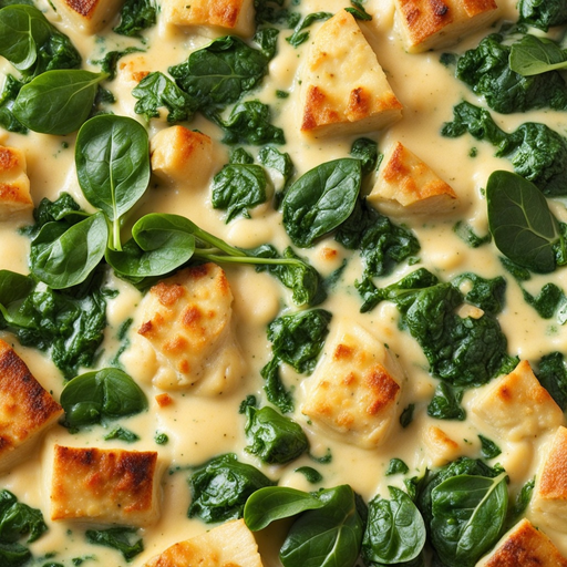 Um prato reconfortante com frango macio, molho cremoso e espinafre nutritivo.
