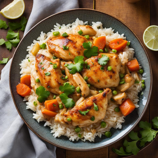 Um prato saboroso e reconfortante feito com frango desossado macio, alho fragrante e arroz branco fofo em um caldo de galinha com baixo teor de sódio.