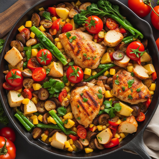 Uma refeição deliciosa e nutritiva preparada em uma frigideira, repleta de frango, legumes e temperos saborosos.