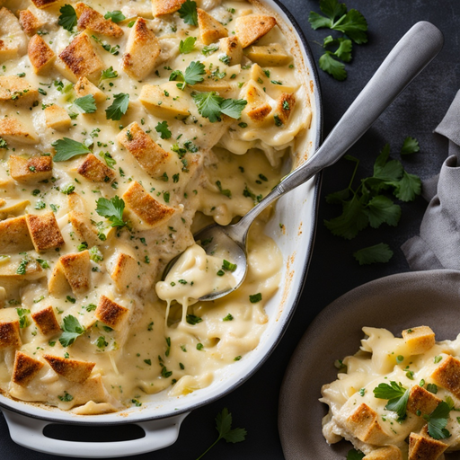 Molho alfredo cremoso misturado com frango e assado com batatas para uma refeição reconfortante e satisfatória.