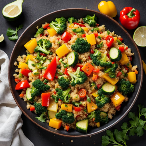 Um stir-fry saudável e colorido com quinoa e uma variedade de legumes frescos