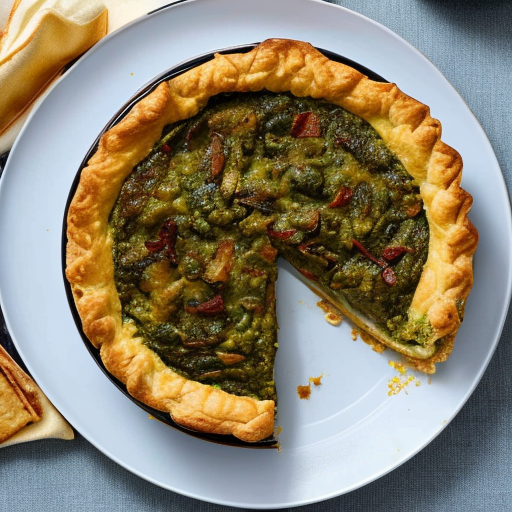 Uma torta deliciosa e substancial feita com batatas, feijão cozido, cebola roxa, pimentão vermelho, pimentas, bacon, óleo, pesto e massa folhada.