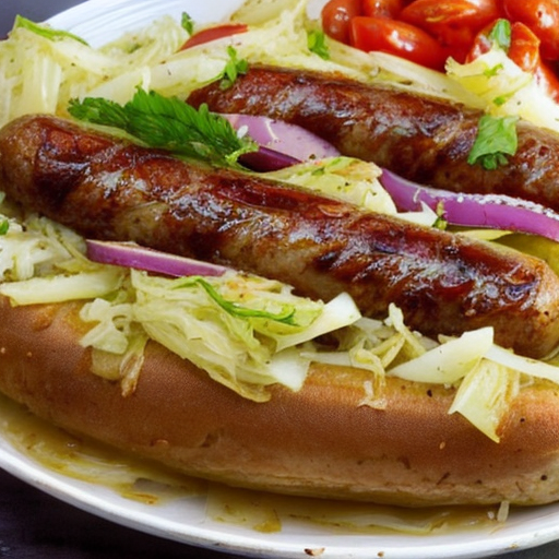 Um prato delicioso feito com bratwurst, batatas e chucrute.
