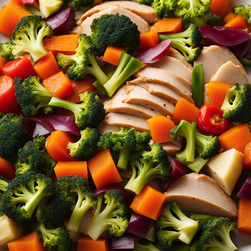Um prato principal simples e saudável que combina frango cozido macio com uma mistura de legumes coloridos.