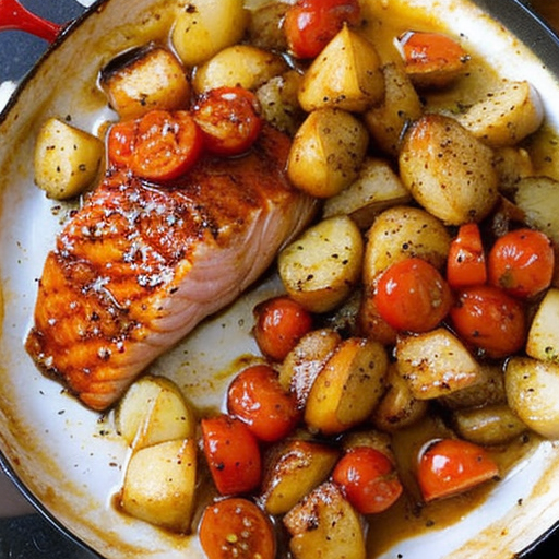 Uma deliciosa receita de salmão assado com xarope de ácer, servido com batatas assadas e legumes.