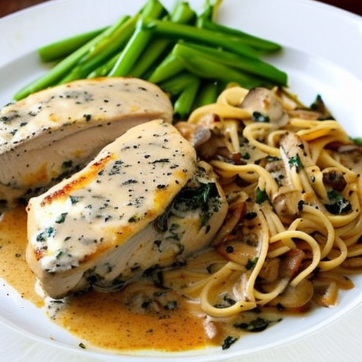 Peito de frango suculento recheado com cream cheese cremoso e servido com um delicioso molho de cogumelos. Um prato principal substancial que é fácil de preparar.