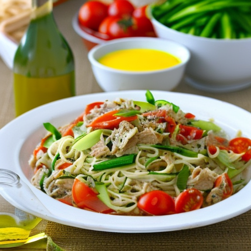 Uma salada refrescante e saudável com atum, tomate fresco, cebolinha, abobrinha e macarrão de ovo.
