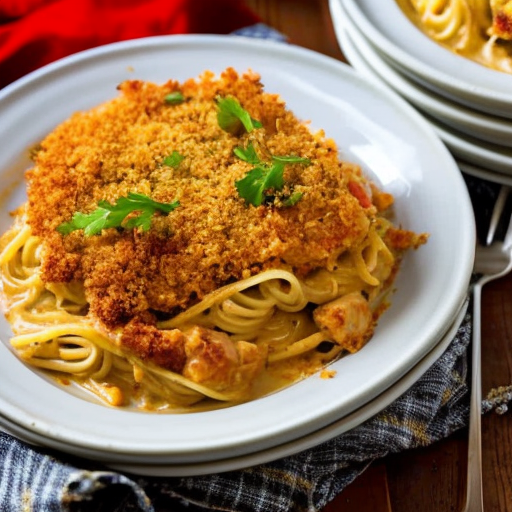 Uma deliciosa e cremosa massa de frango assado feita com coxas de frango macias, sopa cremosa de frango, panko crocante, e manteiga. Servido sobre spaghetti para uma refeição satisfatória.