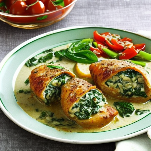 Peitos de frango suculentos recheados com um recheio cremoso de espinafre, envoltos em bacon crocante e cozidos em um molho saboroso de caldo de galinha.