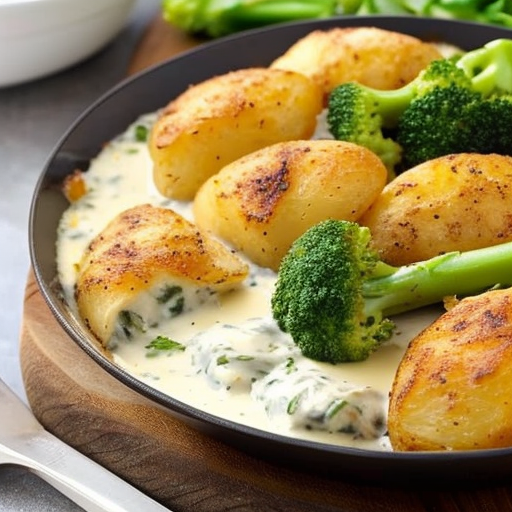 Um delicioso e cremoso frango alfredo assado com floretes de brócolis