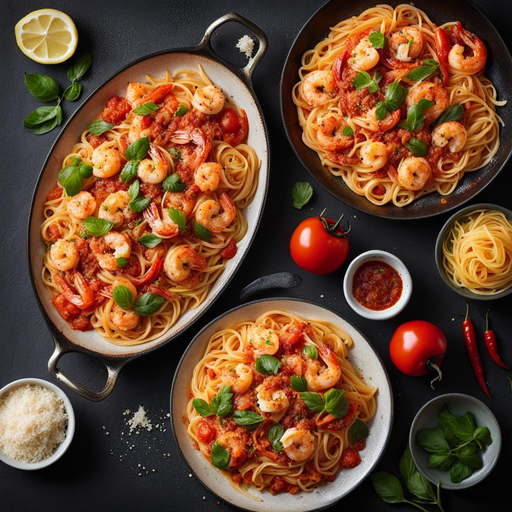 Um prato de massa saboroso e picante com camarão suculento