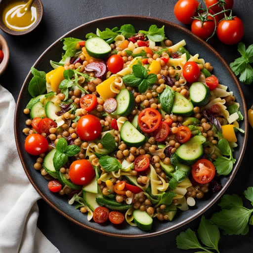 Uma salada robusta e satisfatória que combina lentilhas marrons e macarrão gravata para uma refeição deliciosa