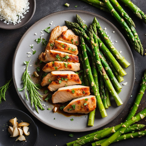 Um prato delicioso e saudável feito com peito de frango desossado e tenro e aspargos frescos, temperados com alho para um toque saboroso.