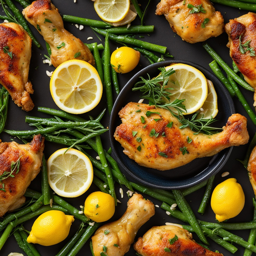 Coxas de frango deliciosas e saborosas marinadas em limão e alho, servidas com tenros haricots verts.