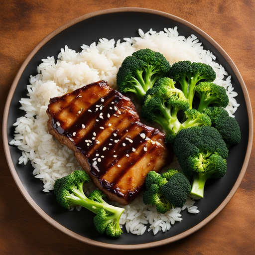 Costeletas de porco deliciosas e saborosas banhadas em molho teriyaki, servidas com arroz branco fofo e brócolis no vapor.