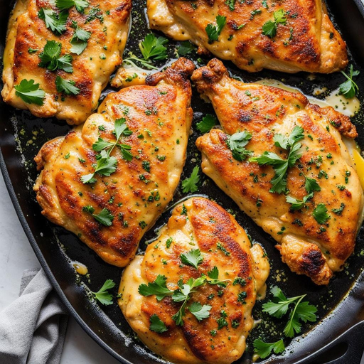 Um prato delicioso e saboroso de frango cozido à perfeição em um molho de manteiga de alho.