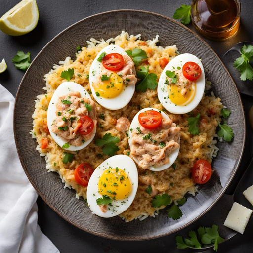 Deliciosos ovos recheados e ricos em proteínas com um recheio saboroso de atum e mussarela, servidos com arroz basmati fragrante.