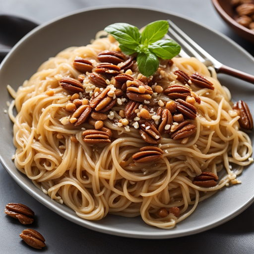 Um prato doce e salgado de macarrão com um toque crocante de nozes, perfeito para uma refeição deliciosa.