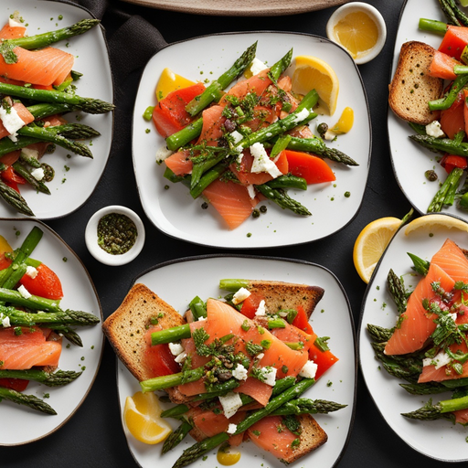 4. 4. Arrume os aspargos grelhados, pimentão em fatias, salmão defumado, alcaparras e pão torrado em um prato de servir.