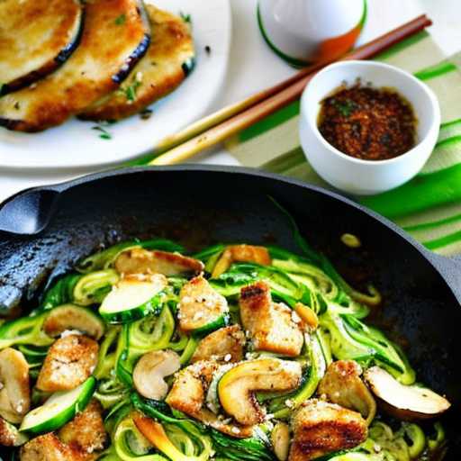 Um prato delicioso e saudável feito com macarrão de abobrinha salteado, peito de frango desossado e cogumelos frescos em um molho cremoso de gergelim.